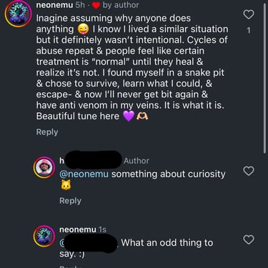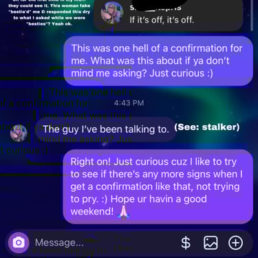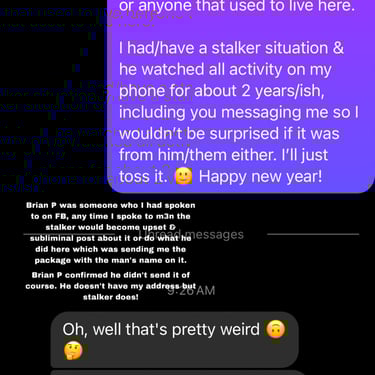I’ve quietly endured a long-term campaign of unwanted attention, manipulation, and psychological pressure that has affected my physical space, muted my ability to share my gifts with the world out of fear that they’d misuse something I said or did again, prevented me from feeling safe going places, talking to my friends, celebrating or supporting them, or taking performance gigs. They would send packages to my home with the friend's I had JUST talked to on my cell to scare me after watching my cell activity for YEARS, had people I consider "friends" express interest in knowing everyone and everywhere I hung out, sent people towards me to get my new cell phone number once I finally started becoming aware of the surveillance, and even involved my own neighbor Robert in 203 in covering up their packages by reclaiming them from me and even rushing to try to steal my new phone off of my porch right after I checked my cell phone they were watching and saw it's delivery notice). This has deeply affected my emotional well-being and it is very clear that it has been intentional all along. While I’ve taken action behind the scenes, the truth is that I’ve carried this alone for too long. That ends now.